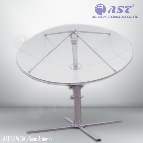 The AST 3.0m (9.8 ft) antenna delivers exceptional performance for transmit/receive and receive only applications for C-band and Ku-band frequencies. This antenna offers a reflector design that incorporates precision-formed panels, truss radials and hub assembly using matched tooling for interchangeable components. It features an innovative Cassegrain or Ring Focus feed and sub-reflector design which results in high gain, low noise temperature, high antenna efficiency and excellent rejection of noise and microwave interference. A large center hub provides spacious accommodation for equipment mounting. The reflector is supported by a galvanized elevation over azimuth kingpost pedestal that provides the required stiffness for pointing and tracking accuracy. The pedestals are designed for full orbital arc coverage and are readily adaptable to ground or rooftop installations.