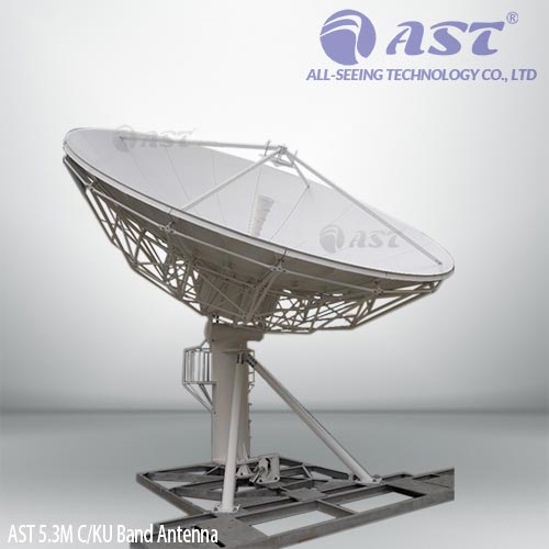 The AST 5.3m (17 ft) antenna delivers exceptional performance for transmit/receive and receive only applications for C-band and Ku-band frequencies. This antenna offers a reflector design that incorporates precision-formed panels, truss radials and hub assembly using matched tooling for interchangeable components. It features an innovative Cassegrain or Ring Focus feed and sub-reflector design which results in high gain, low noise temperature, high antenna efficiency and excellent rejection of noise and microwave interference. A large center hub provides spacious accommodation for equipment mounting. The reflector is supported by a galvanized elevation over azimuth kingpost pedestal that provides the required stiffness for pointing and tracking accuracy. The pedestals are designed for full orbital arc coverage and are readily adaptable to ground or rooftop installations.