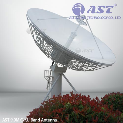 The AST 9.0m (30 ft) antenna delivers exceptional performance for transmit/receive and receive only applications for C-band and Ku-band frequencies. This antenna offers a reflector design that incorporates precision-formed panels, truss radials and hub assembly using matched tooling for interchangeable components. It features an innovative Cassegrain or Ring Focus feed and sub-reflector design which results in high gain, low noise temperature, high antenna efficiency and excellent rejection of noise and microwave interference. A large center hub provides spacious accommodation for equipment mounting. The reflector is supported by a galvanized elevation over azimuth kingpost pedestal that provides the required stiffness for pointing and tracking accuracy. The pedestals are designed for full orbital arc coverage and are readily adaptable to ground or rooftop installations.